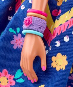 Barbie wears a beautiful, traditional ruffled dress adorned with intricate, vibrant details.