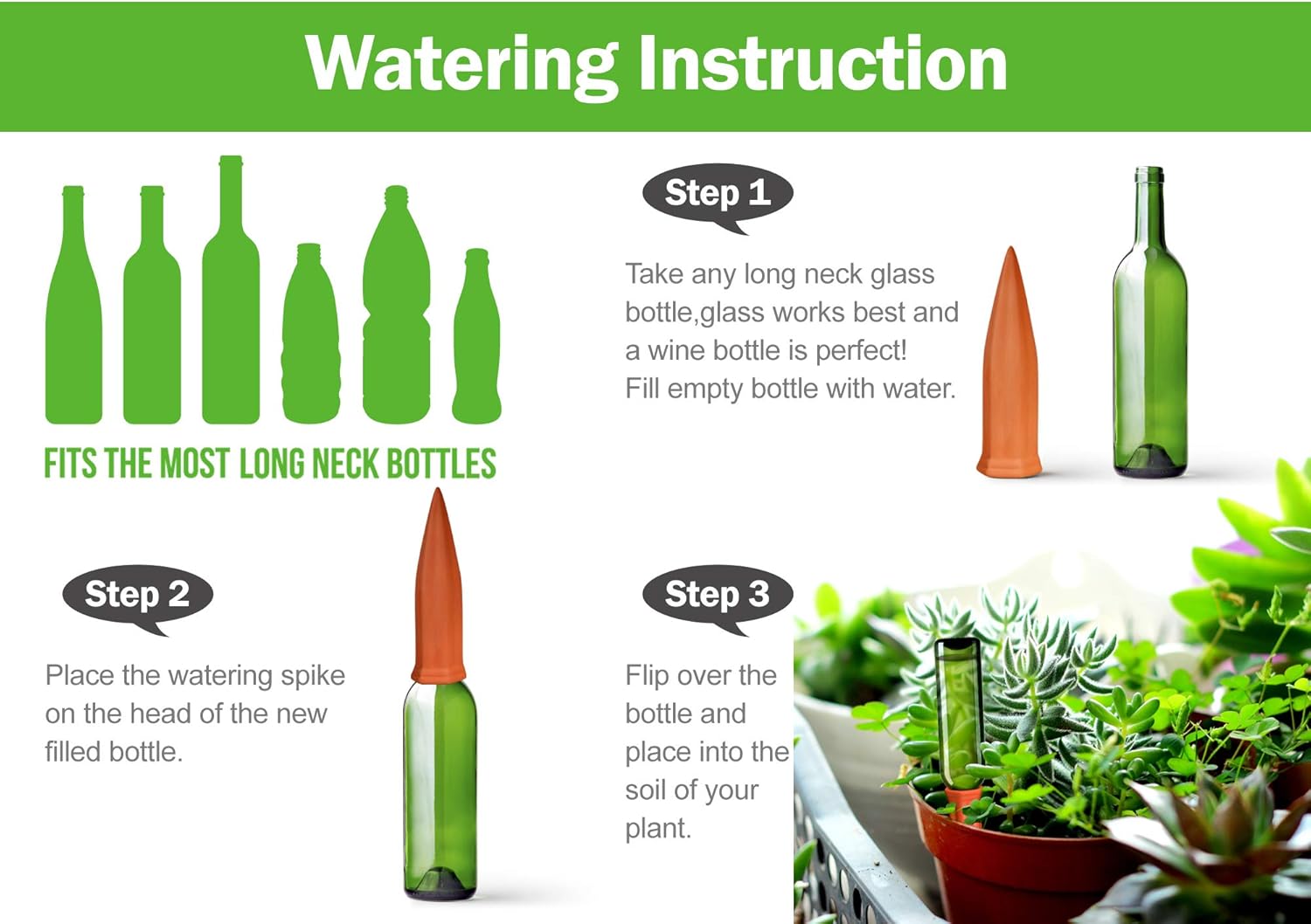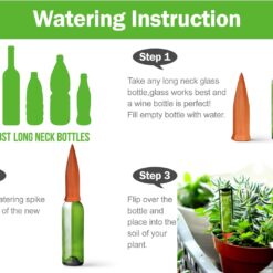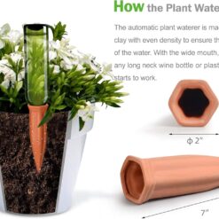 Simple to Use: Just insert a filled wine bottle (or similar bottle with a narrow neck) into the terracotta spike, then insert the spike into the plant’s soil. The porous terracotta slowly releases water as the soil dries, preventing over or under-watering.