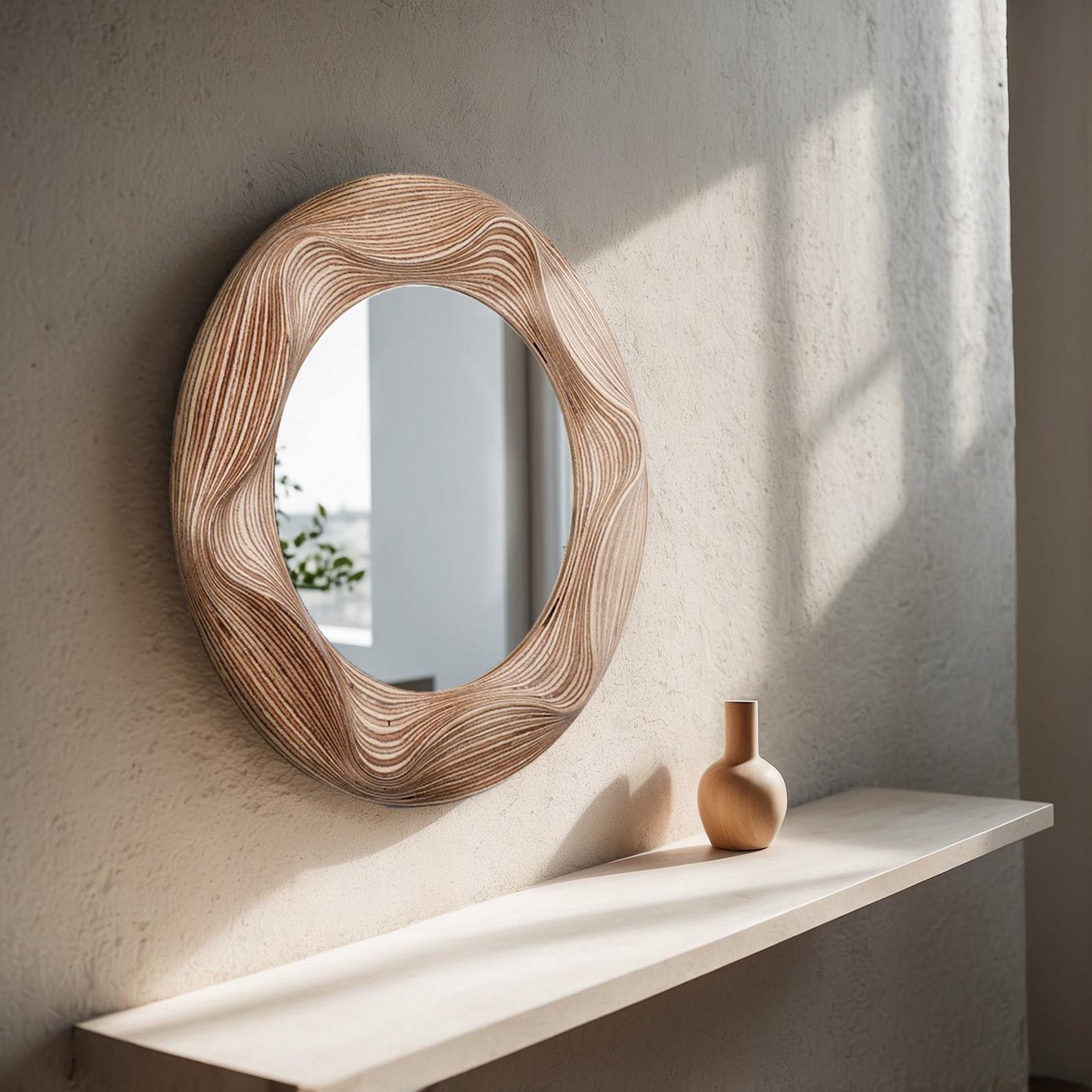 “ Elevate Your Home Decor: This elegant round wood mirror features a unique, organic asymmetrical shape, adding a touch of modern artistry to any room.