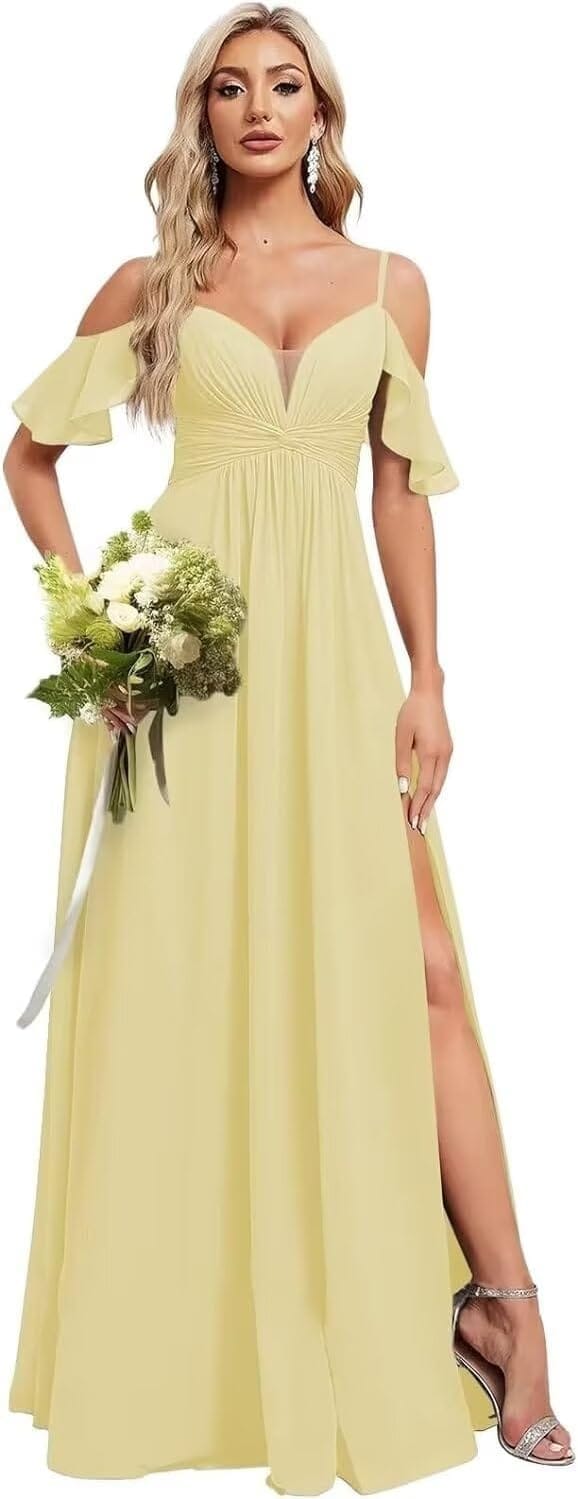 Elegant Off-the-Shoulder Design: Show off your shoulders with this chic and flattering neckline, perfect for a modern bridesmaid look.