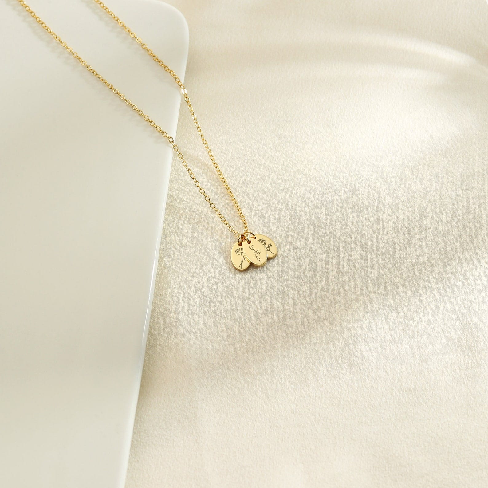 “ A Timeless Keepsake: Celebrate the special bond of family with our Engraved Birth Flower Name Necklace. This personalized necklace beautifully combines delicate birth flower charms with custom engraved names, creating a truly unique and sentimental piece.