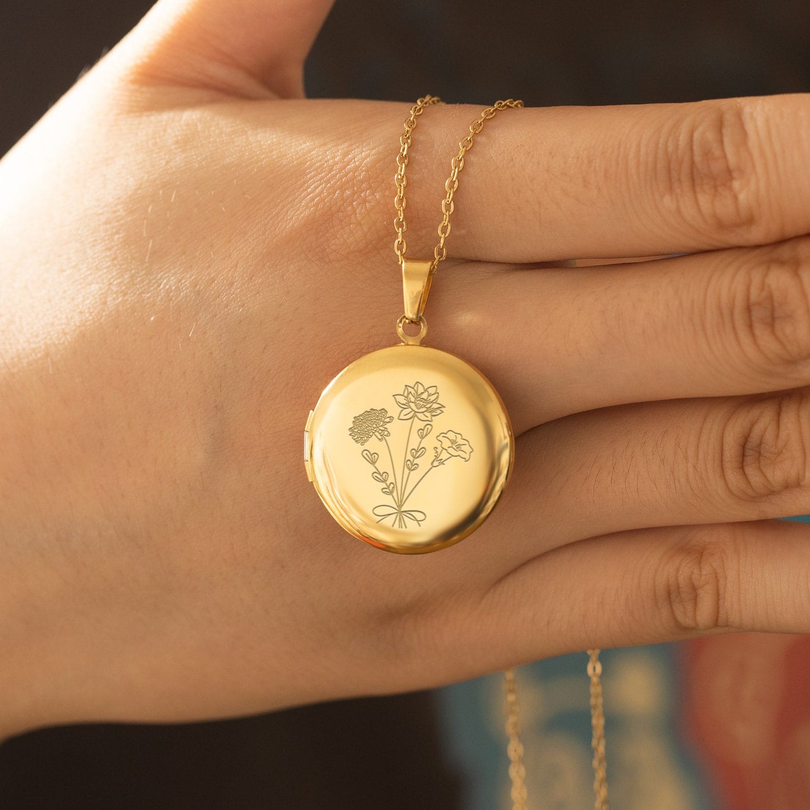 “ Cherish your precious family memories with our Personalized Family Photo Necklace. This exquisite locket necklace features a custom birth flower bouquet design, making it a unique and sentimental piece.